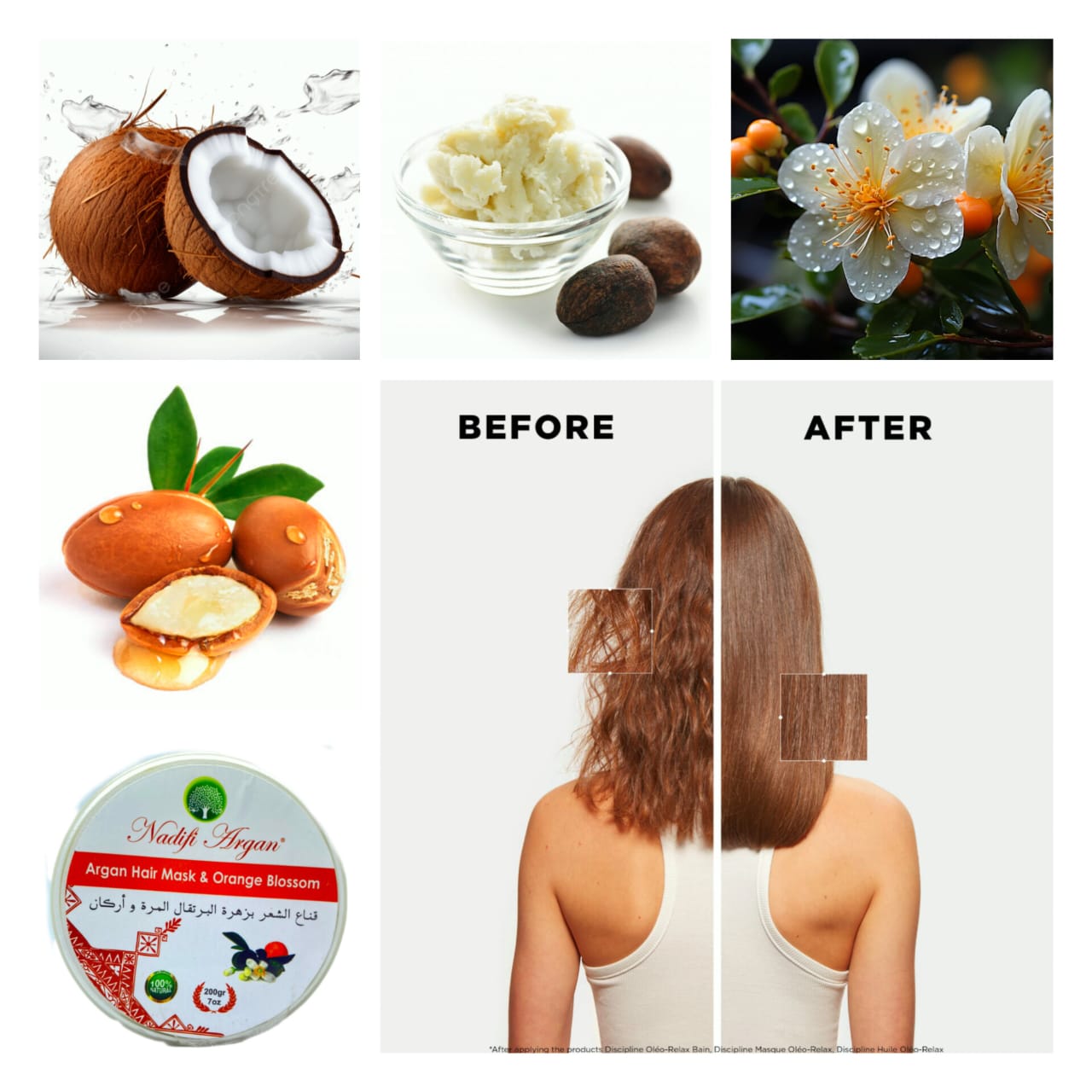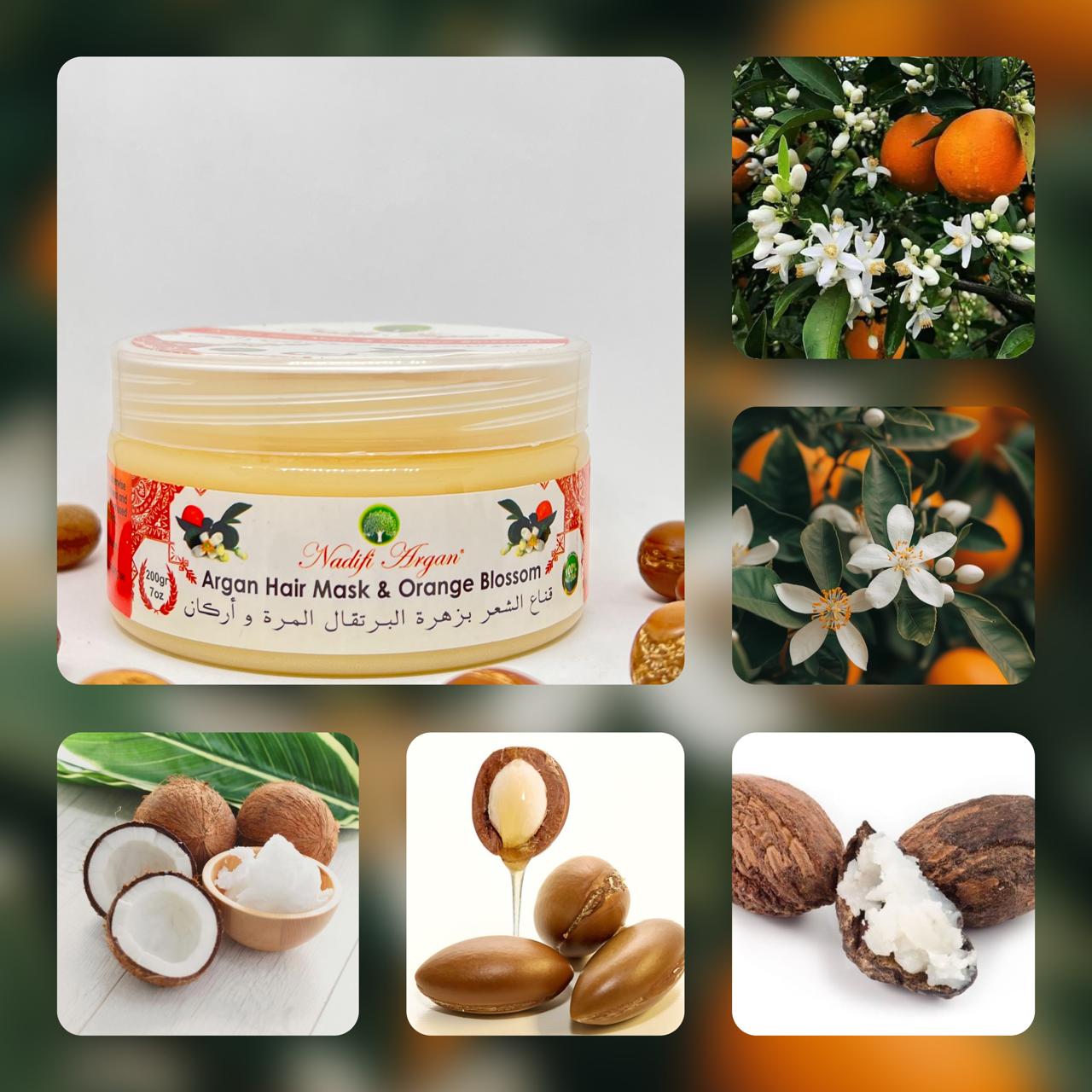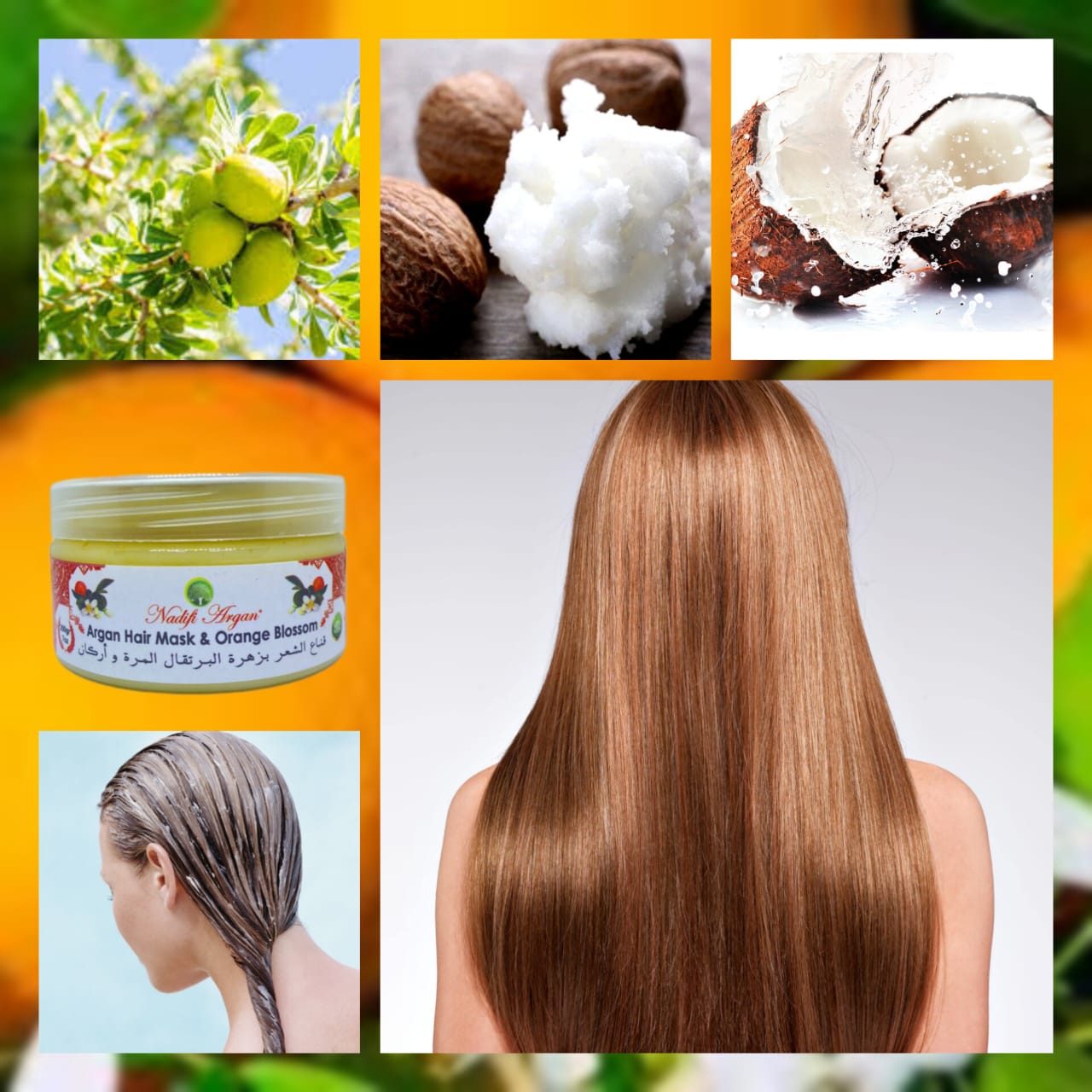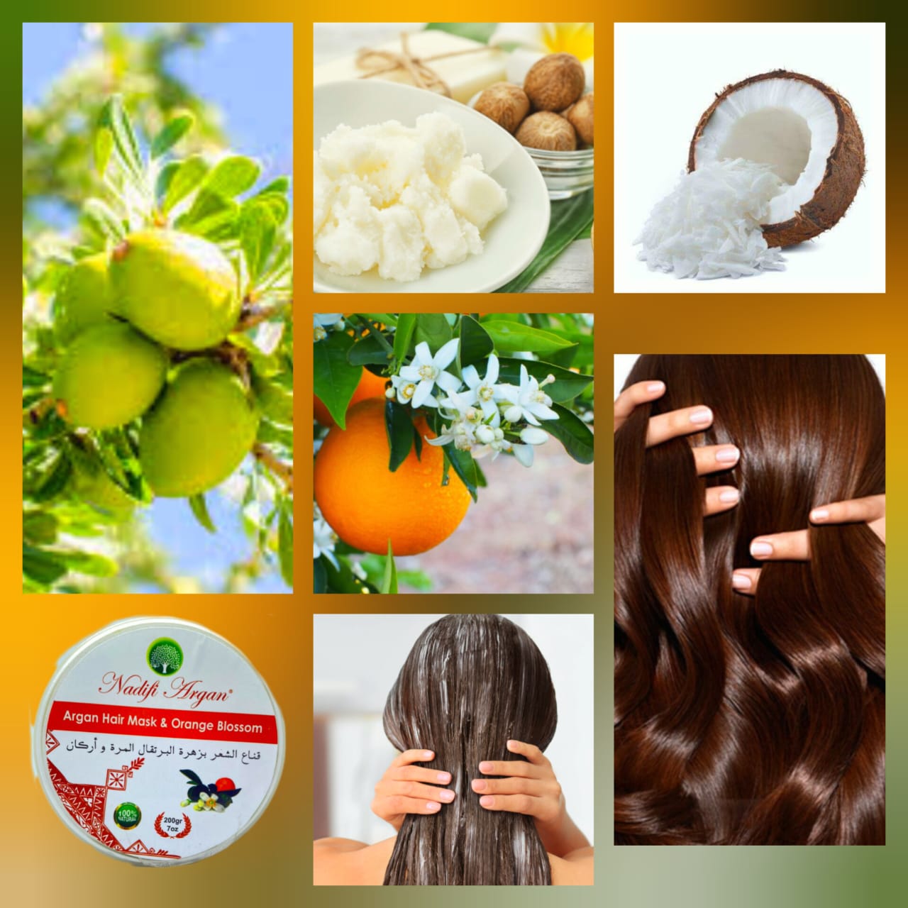 Benefits: Nadifi Argan Hair Mask & Orange Blossom is ideal for dry damaged & color treated hair. It will give your hair the care it deserve with our Nadifi Argan Oil that helps repair and condition your hair from damages caused by years of color treatment and straightening, restore the softness, bounce, shine, nourish the hair deeply to prevent it from drying out, give your hair lasting protection, reduce hair breakage, make your hair feel healthy, boost to grow, add shine and even fight off infections.
