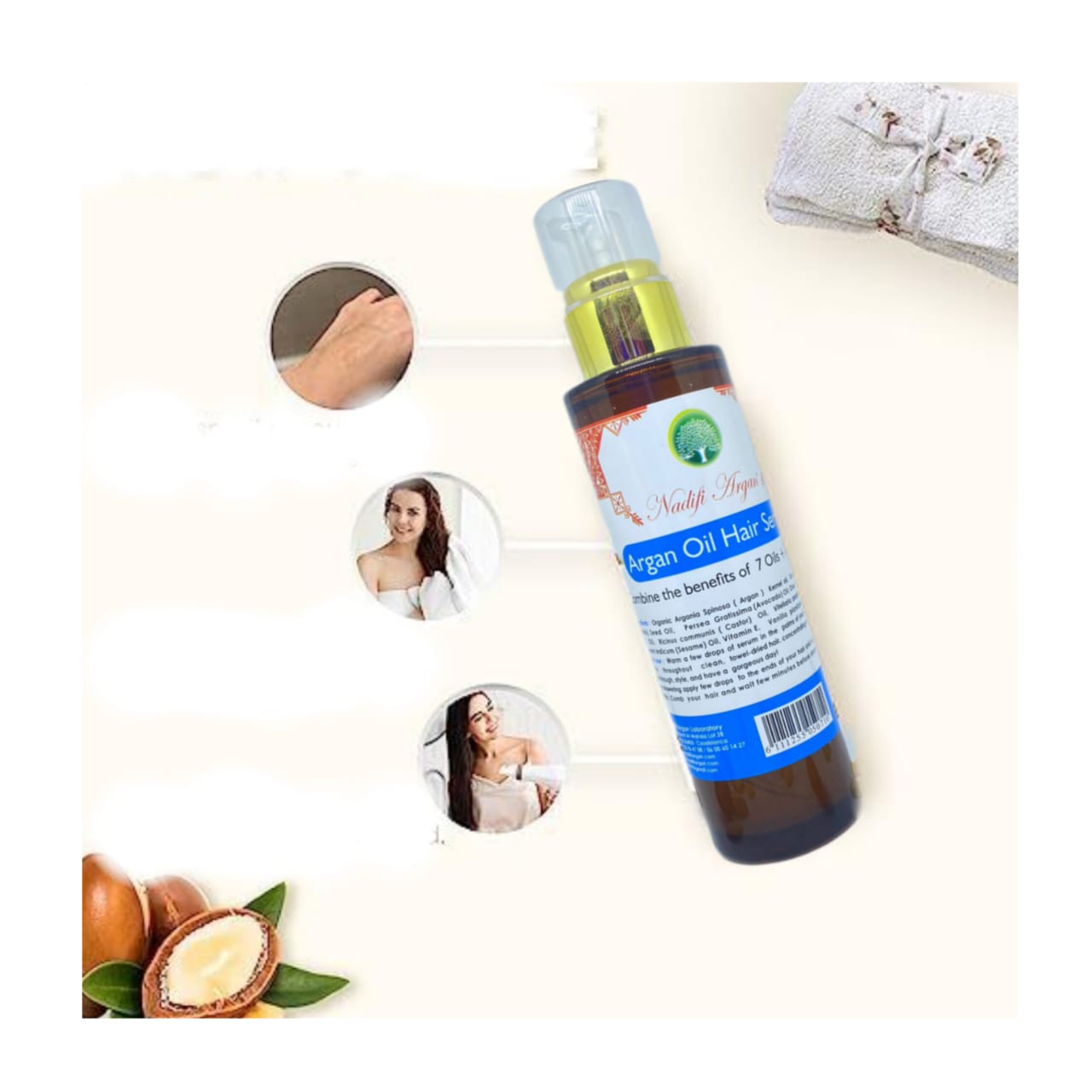 Nadifi Argan Oil Hair Serum combines the power of seven oils: Argan oil, Avocado oil, Jojoba oil, Castor oil, Olive oil, Sesame oil, Shea butter, and Coconut oil, creating the ultimate hair treatment that fights frizz while leaving your hair shiny and silky to the touch.