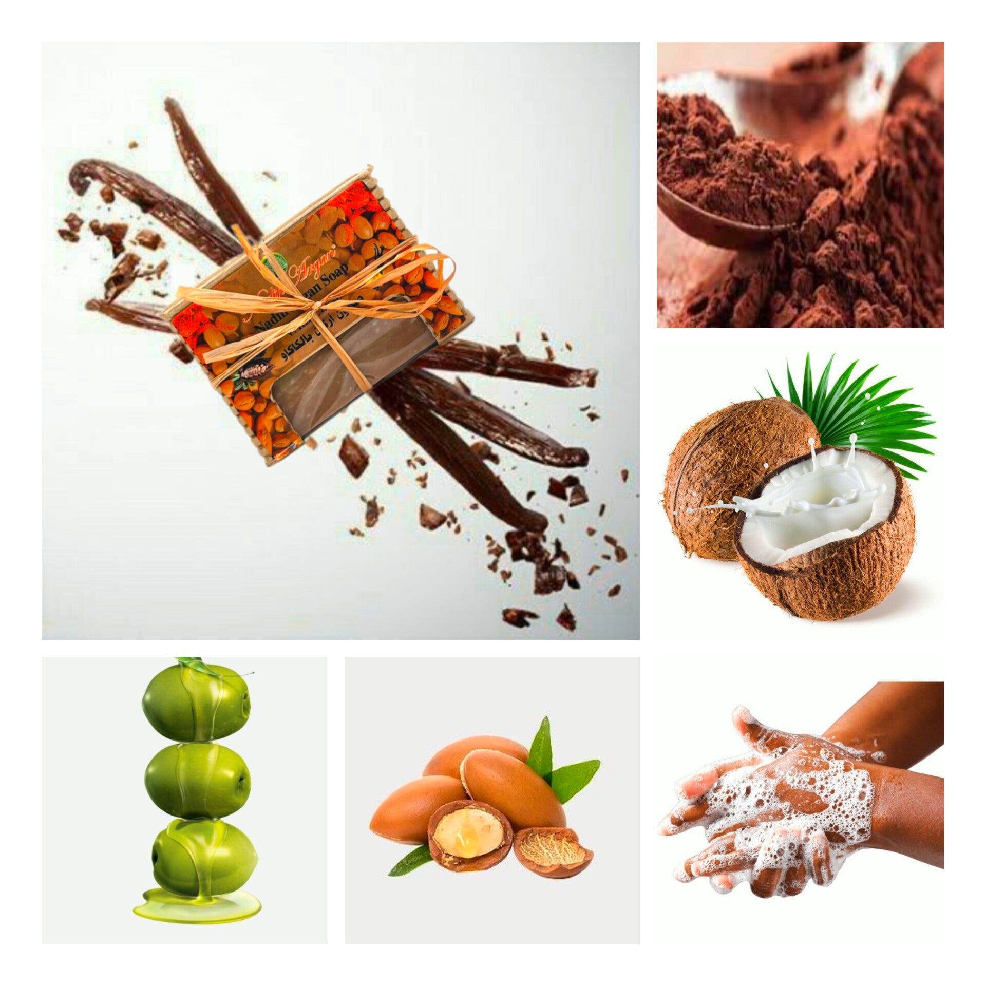 Ingredients: Pure Certificated Argan Oil (Argania Spinosa Kernel Oil), Olive Oil, Palm Oil, Argan paste, Coconut Oil, Vanilla extract, Cacao Powder, Rain Water, Sodium Hydroxide, Natural Beeswax.