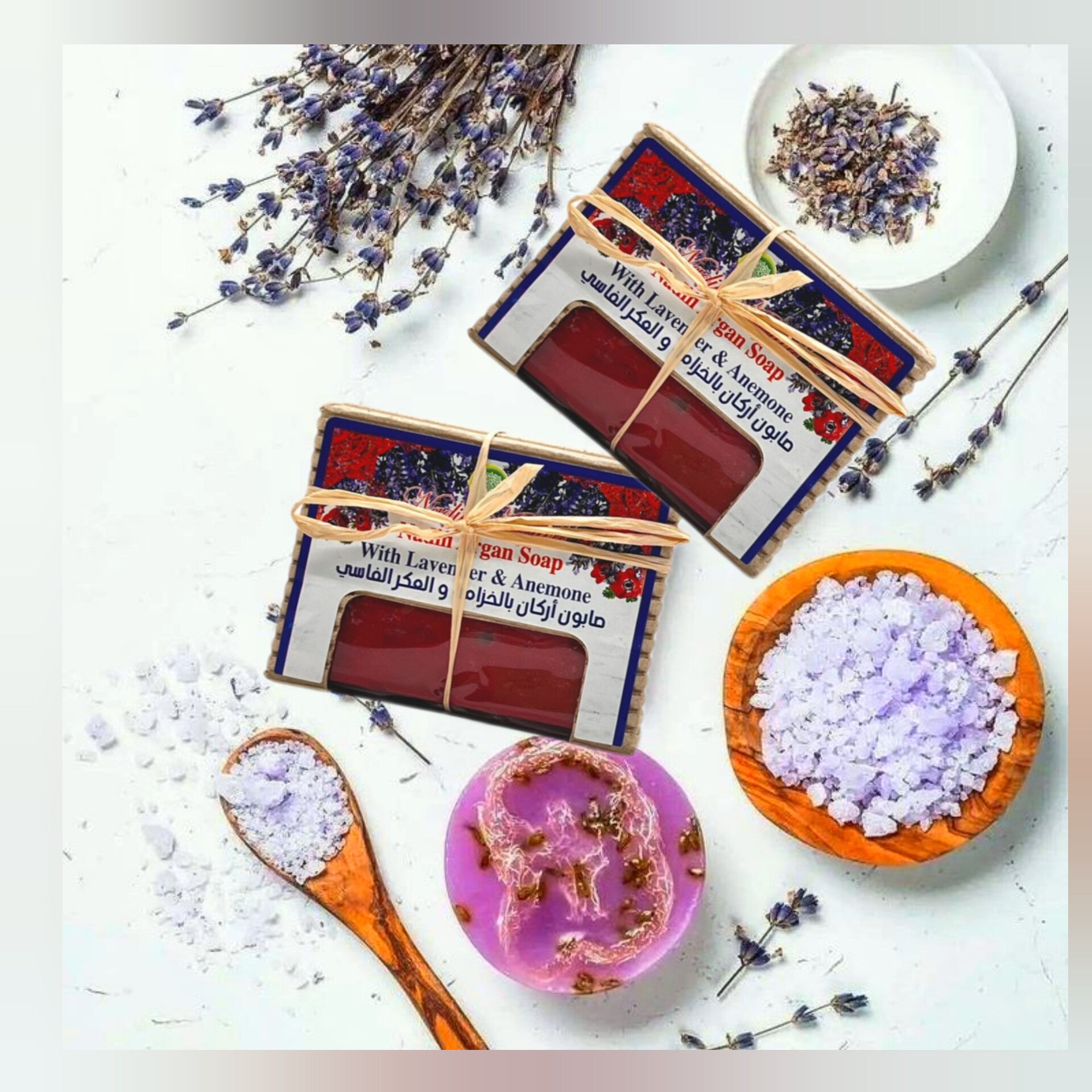 Ingredients: Pure Certificated Argan Oil (Argania Spinosa Kernel Oil), Olive Oil, Palm Oil, Coconut Oil, Lavender Essential Oil, Castor Oil, Rain Water, Sodium Hydroxide, Natural Beeswax, Lavender, Anemone Flowers Powder.