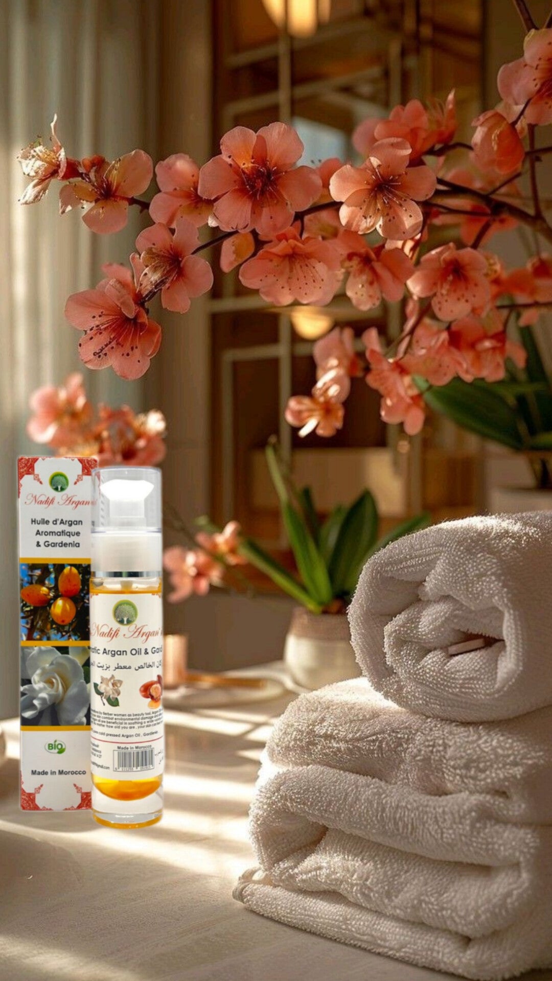 Nadifi Argan brings you the best of Aromatic Argan oil for body and hair, made out of cold pressed organic Argan oil, to which we added Gardenia Essential oil aiming to nourish dry skin, soothe it and perfume it delicately. A recipe that caters to different popular demands thanks to its firming, nourishing, refining and toning. Argan oil is a true secret of ancestral beauty used by Berber women to maintain their beauty. This fragrant argan oil is a beauty elixir 100% natural, vegetable and organic, without chemical additives or preservatives.
