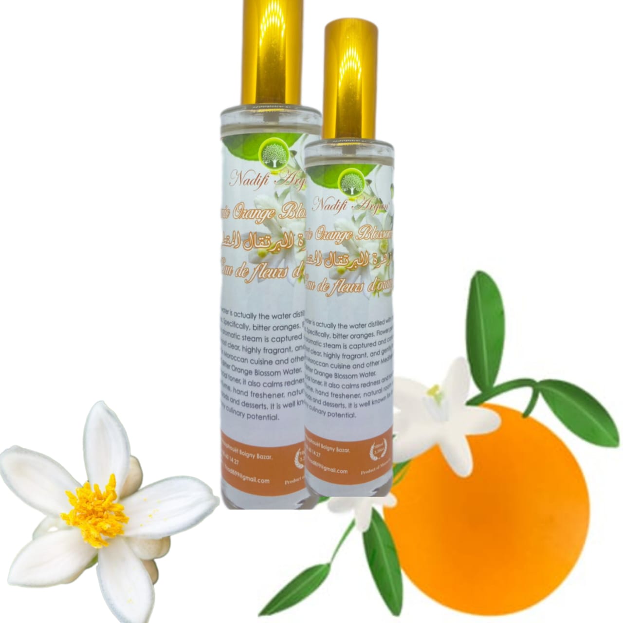 Orange blossom water: is produced by water distillation of flowers from the bitter orange tree. Flower petals are gently boiled in water, and the aromatic steam is captured and condensed to produce this delicately flavored liquid.