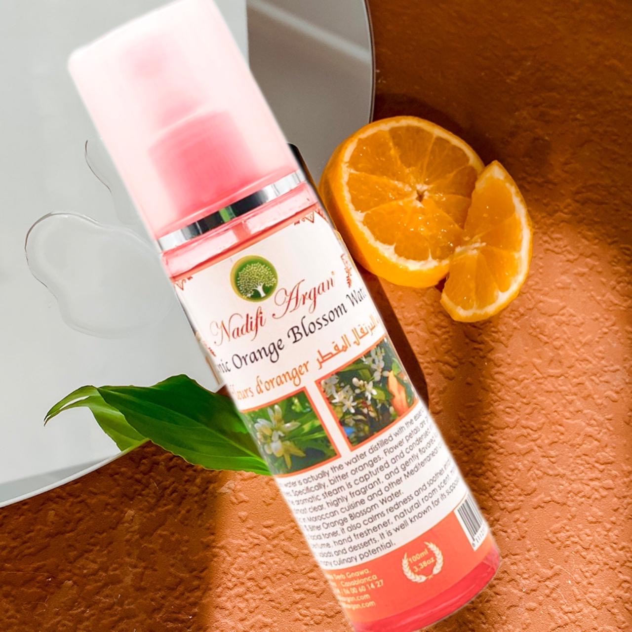 Orange blossom water is actually the water distilled from the essence of flowers from orange trees, specifically bitter oranges. Flower petals are gently boiled in water, and the aromatic steam is captured and condensed into a catch, producing an almost clear, highly fragrant, and gently flavored liquid.