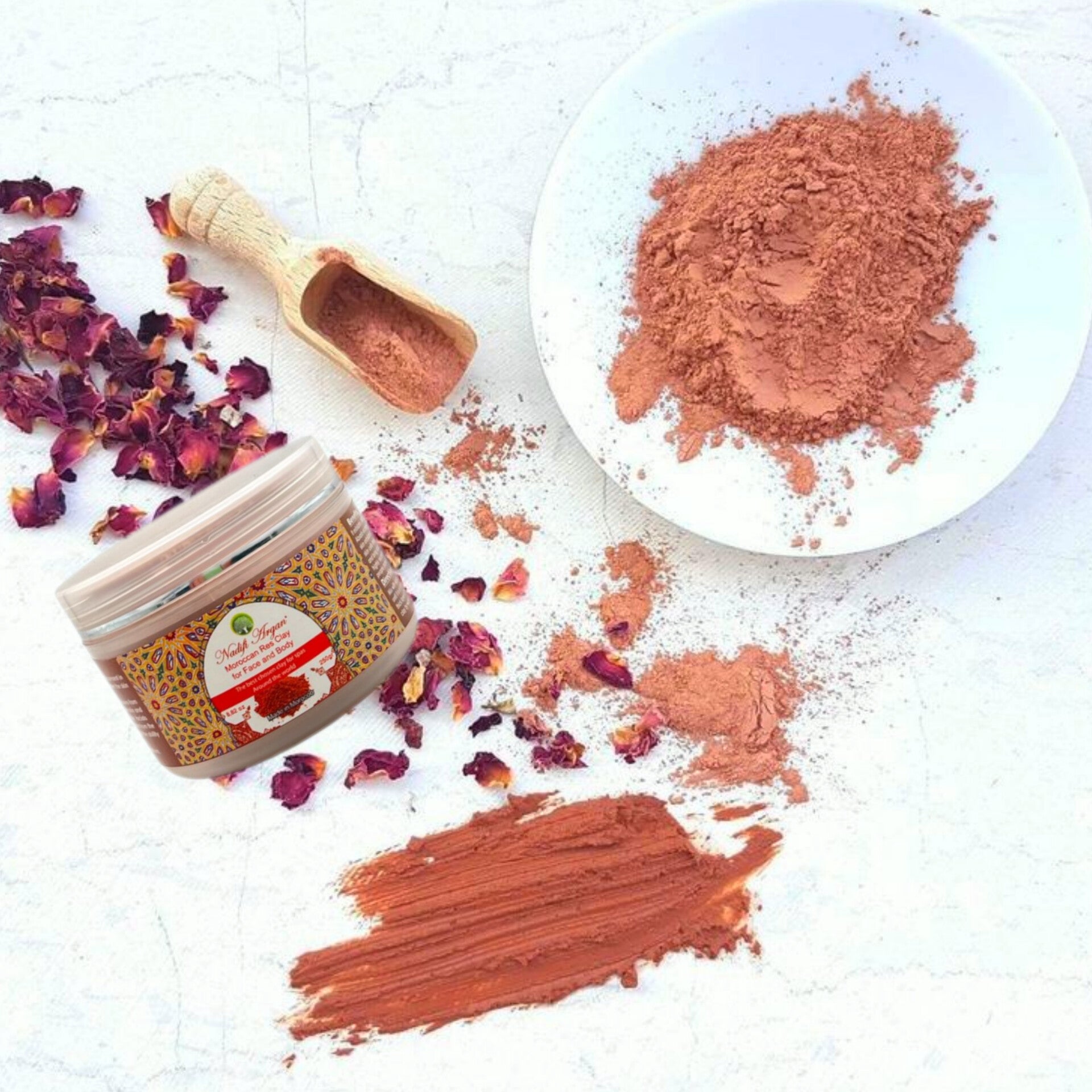 Moroccan Red Clay has been used for centuries for cosmetics use and is present in almost all traditional beauty regimens. It exfoliates cleans, and invigorates the skin while improving blood circulation.